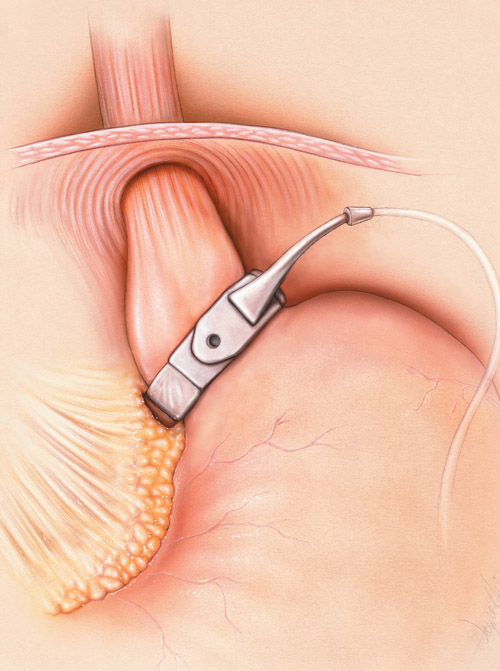 In this procedure, a hollow band made of special material is placed around the stomach near its upper end, creating a small pouch and a narrow passage into the larger remainder of the stomach. The band is then inflated with a salt solution. It can be tightened or loosened over time to change the size of the passage by increasing or decreasing the amount of salt solution. The entire procedure is done laparoscopically, where a laparoscope is inserted through the abdominal wall through small surgical incisions.